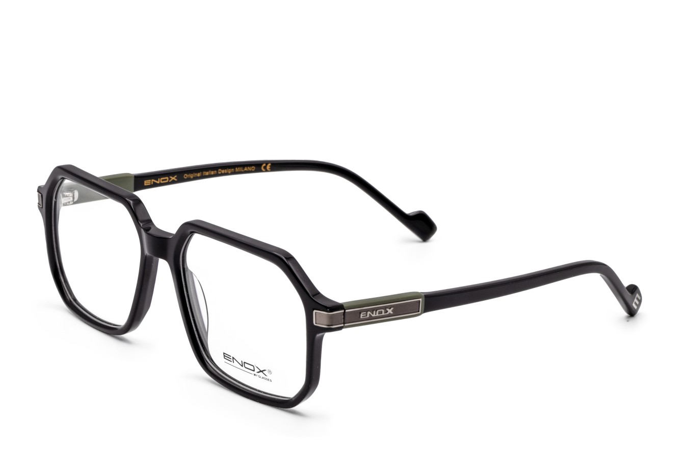 The temples are enhanced thanks to the frieze with the ENOX logo and to the elegant “E” of “ENOX” on the tips. The color variations are all in black, differentiate only from the colored details on the lugs. Its lines, very marked and captivating, make it a comfortable model but with great style and personality.