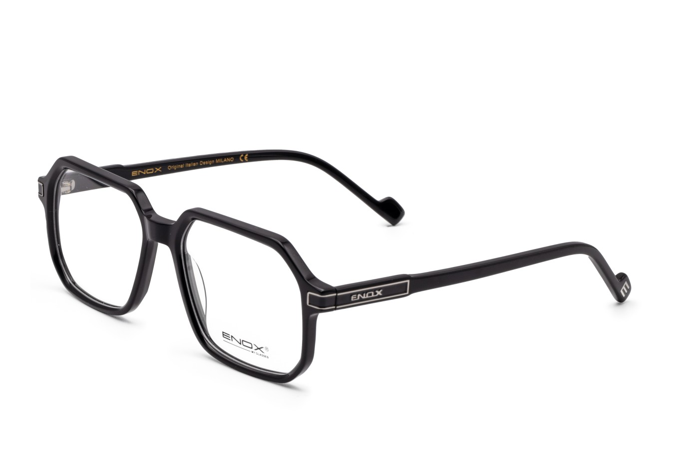 The temples are enhanced thanks to the frieze with the ENOX logo and to the elegant “E” of “ENOX” on the tips. The color variations are all in black, differentiate only from the colored details on the lugs. Its lines, very marked and captivating, make it a comfortable model but with great style and personality.