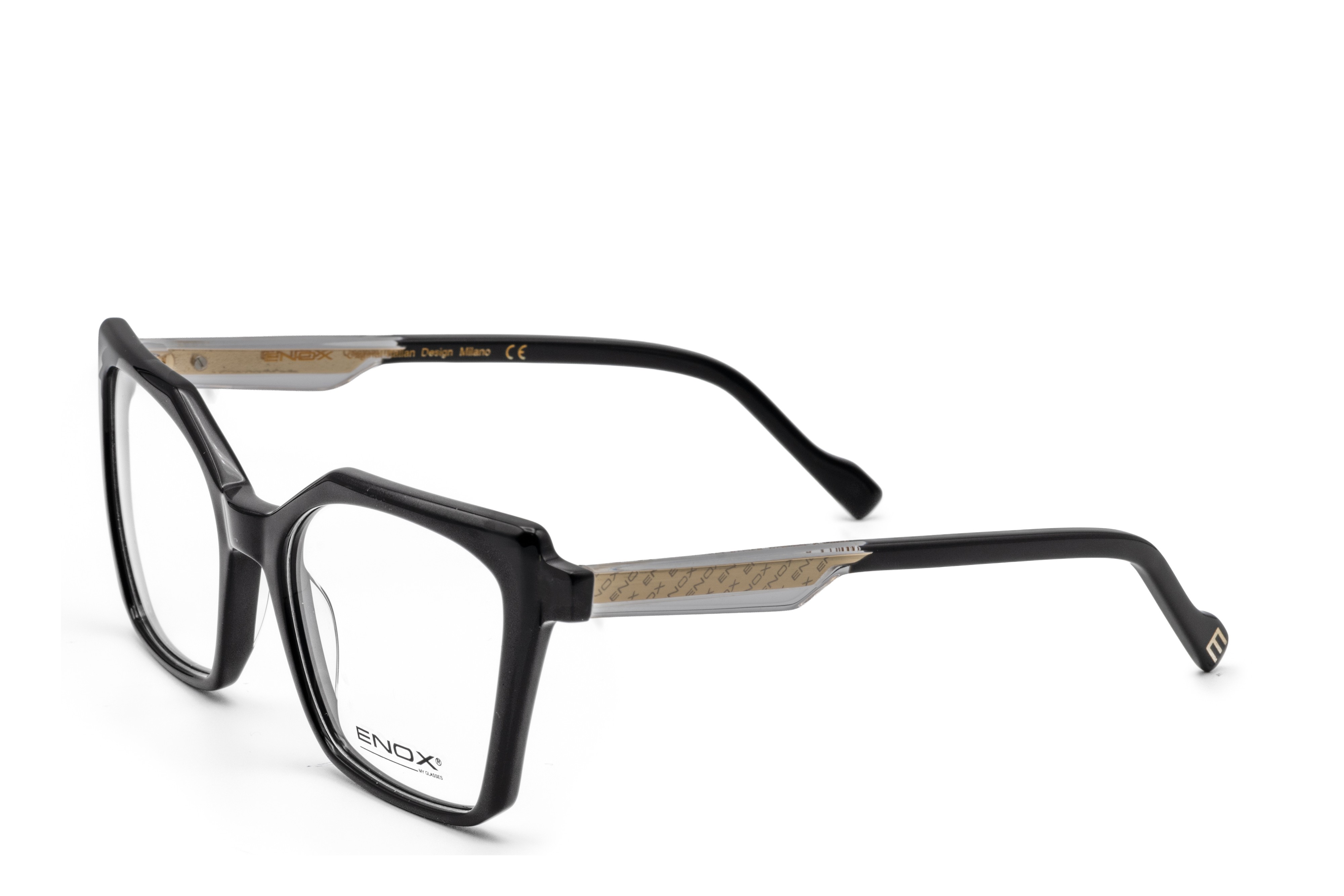 Modello di occhiali da vista in acetato lucido della nuova collezione donna ENOX, dal design sfaccettato e appena cat-eye.