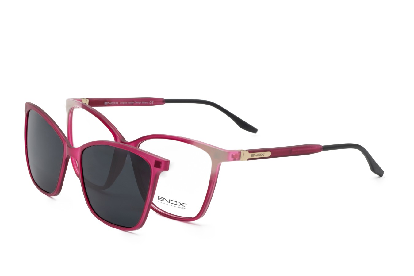 Modello di occhiali da vista della nuova collezione donna ENOX, che si trasformano in occhiali da sole con un semplice gesto.