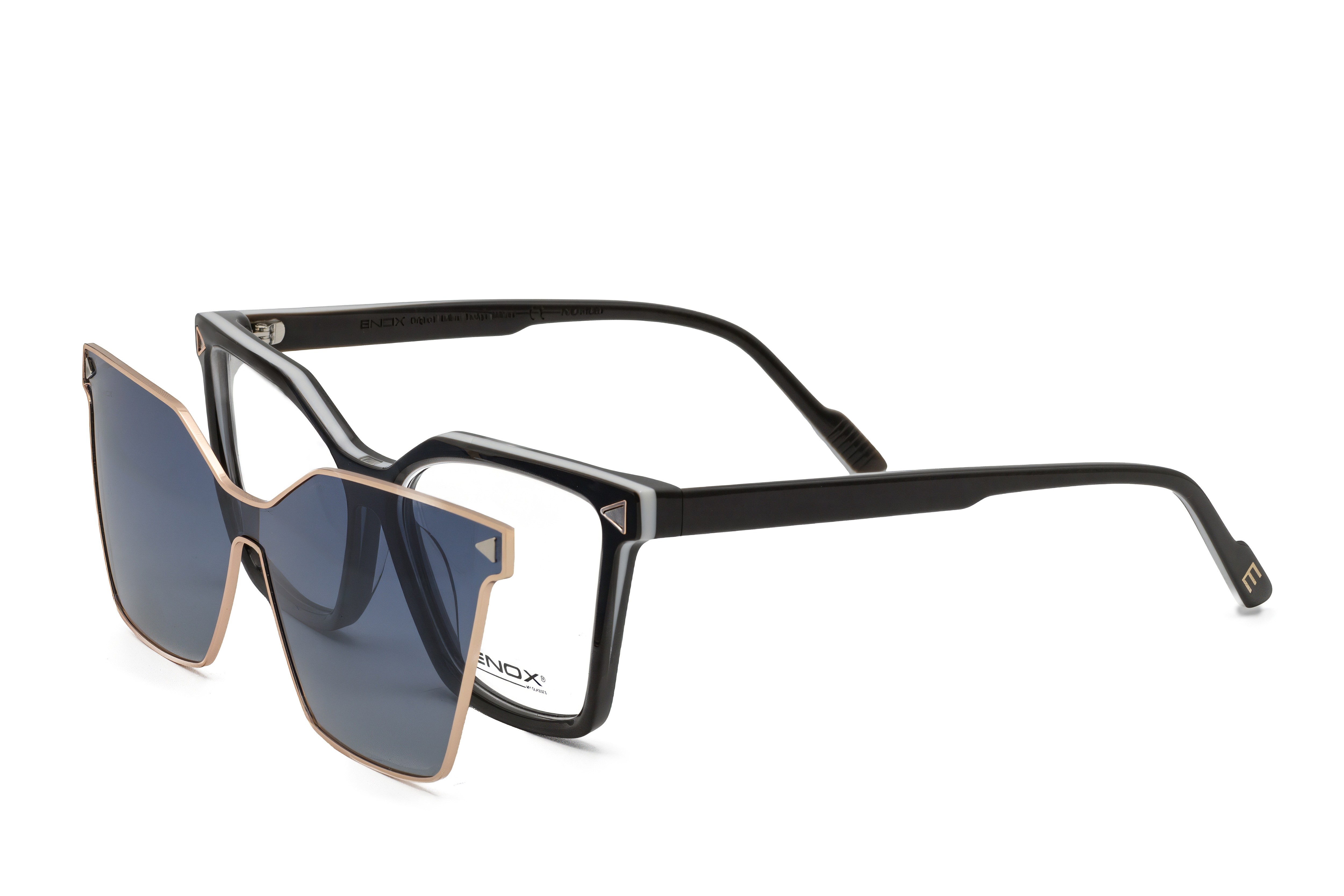 Modello di occhiale da vista della nuova collezione donna ENOX, che si trasforma in occhiale da sole con un semplice gesto.