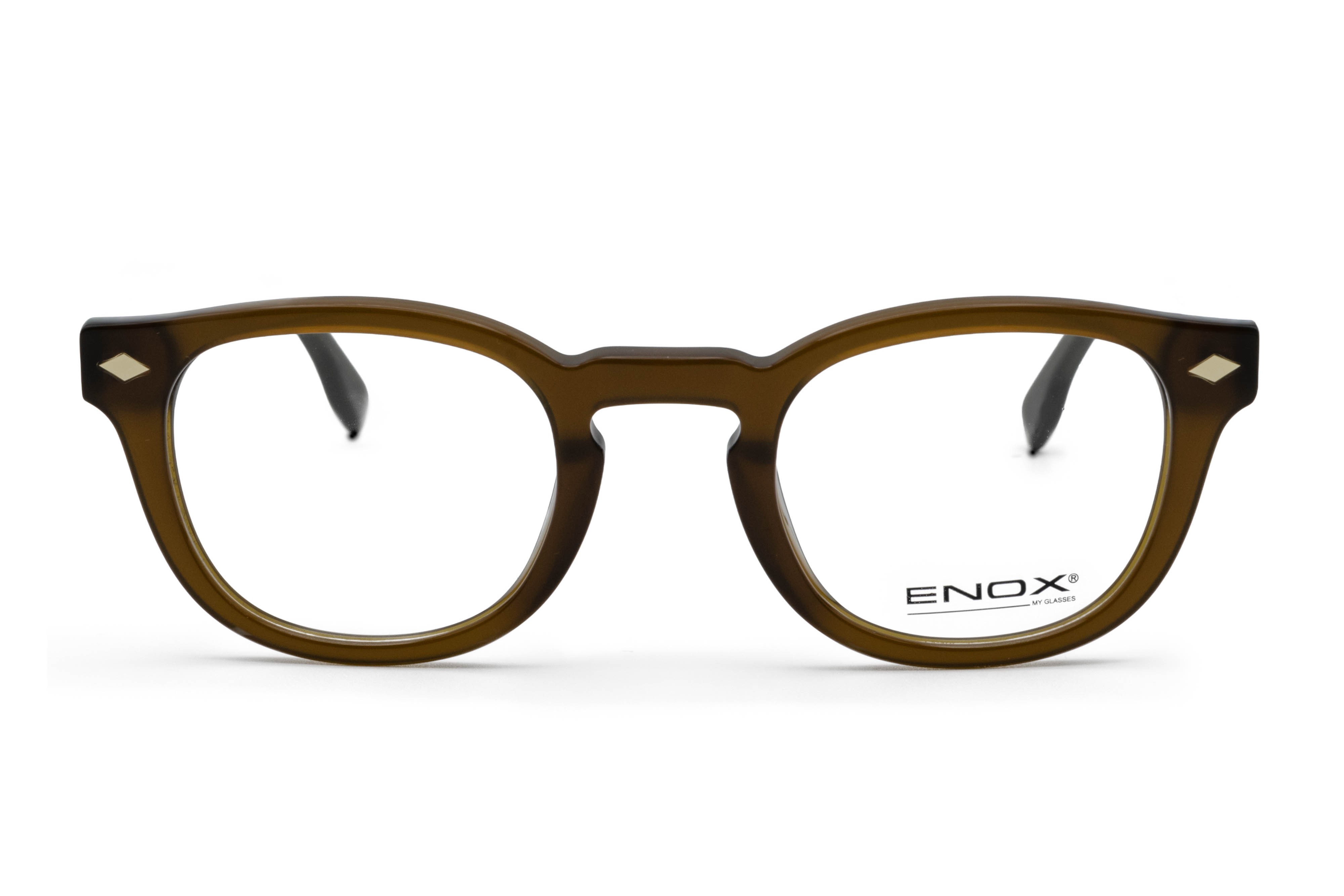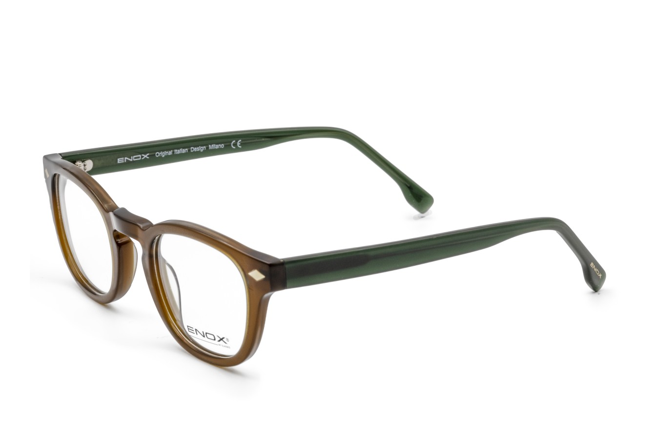Modello evergreen di occhiali da vista unisex, in acetato lucido di alta qualità, che emerge nella nuova collezione ENOX, rinfrescato e aggiornato nelle nuances.