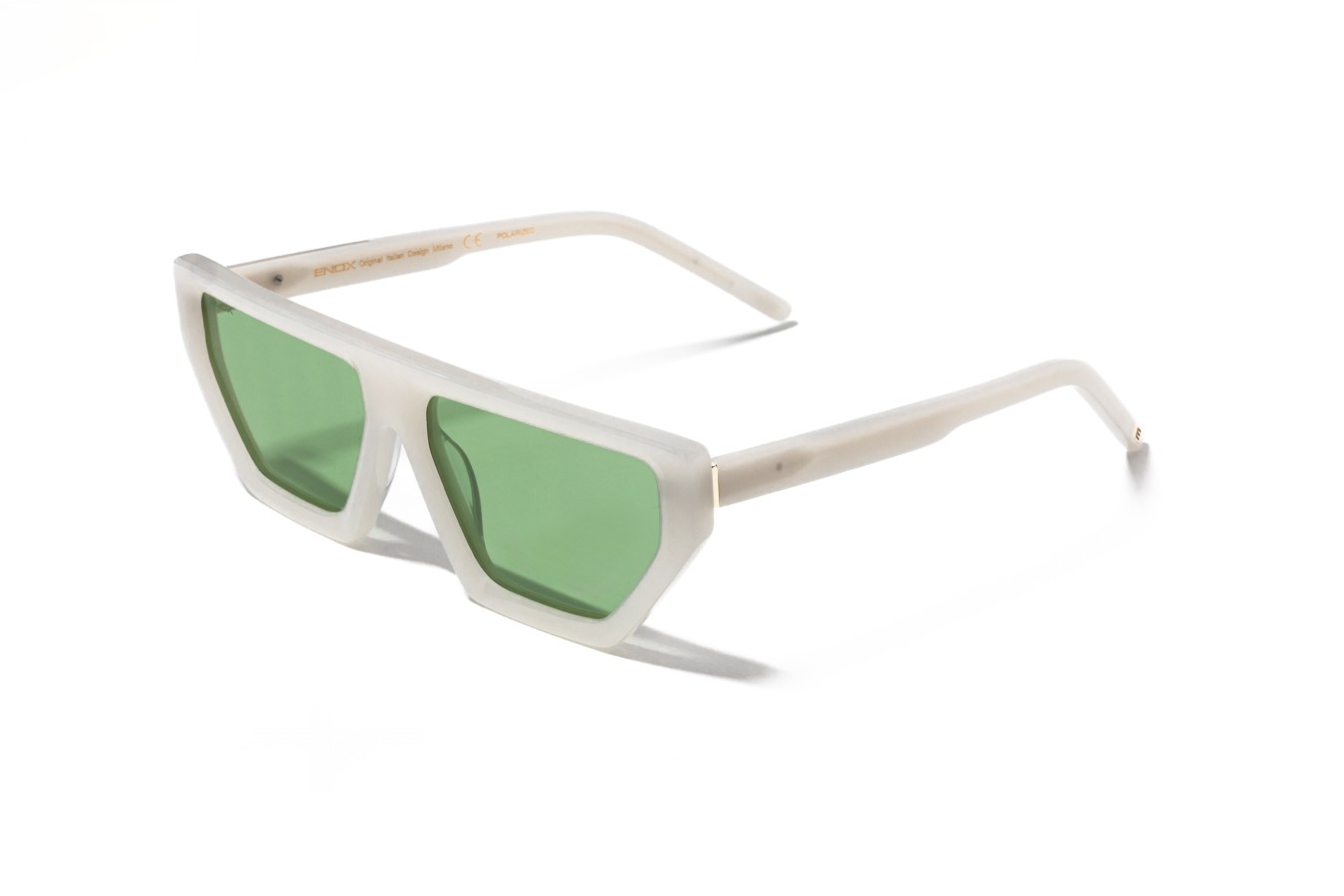 Ha il frontale dal ciliare dritto e le aste con battente in metallo e logo inciso, con la E di ENOX sulla parte terminale. Le colorazioni, dai classici nero e turtle al bianco perla, si accordano perfettamente alle nuances dei filtri polarizzati blu, giallo e verde, garantendo sempre un’adeguata protezione. Questo occhiale ridefinisce l’estetica contemporanea, unendo lo spirito retrò-punk con una visione futuristica, per un modello audace, no gender e inclusivo.